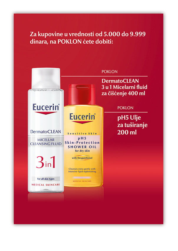 Eucerin® karticu lojalnosti možete dobiti u svakoj apoteci koja učestvuje u Eucerin®programu lojalnosti. Nakon kupovine Eucerin® preparata apotekar će na vašu karticu staviti pečat apoteke. Da biste ostvarili sve prednosti koje dolaze sa Eucerin® karticom lojalnosti, potrebno je da Eucerin® preparate kupujete isključivo u istoj apoteci do 28.2.2018 i da u džepu kartice čuvate fiskalne račune. Nakon kupovine u vrednosti 5.000 dinara, na poklon ćete dobiti Eucerin DermatoClean 3 u 1 Micelarni fluid od 400ml i Eucerin pH5 Ulje za svakodnevno tuširanje od 200 ml.