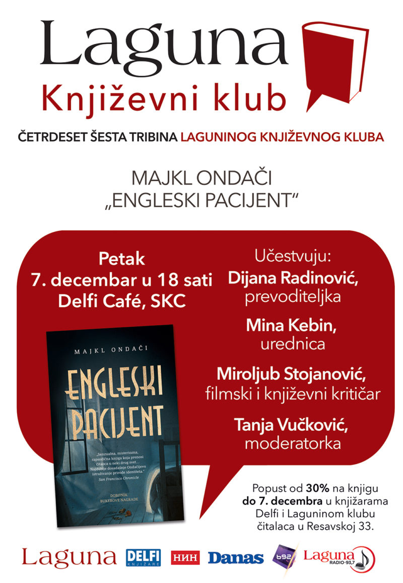 Prvog petka u decembru srešćemo se četrdeset šesti put u okviru Laguninog književnog kluba, 7. decembra od 18 sati u Delfi knjižari u SKC-u, a tema će biti roman koji je obeležio prethodnih 50 godina. Reč je o romanu „Engleski pacijent“ Majkla Ondačija koji je nagrađen Bukerovom nagradom 1992. godine, dok je 2018. dobio i Zlatnog Bukera kao najbolji roman u poslednjih pola veka.