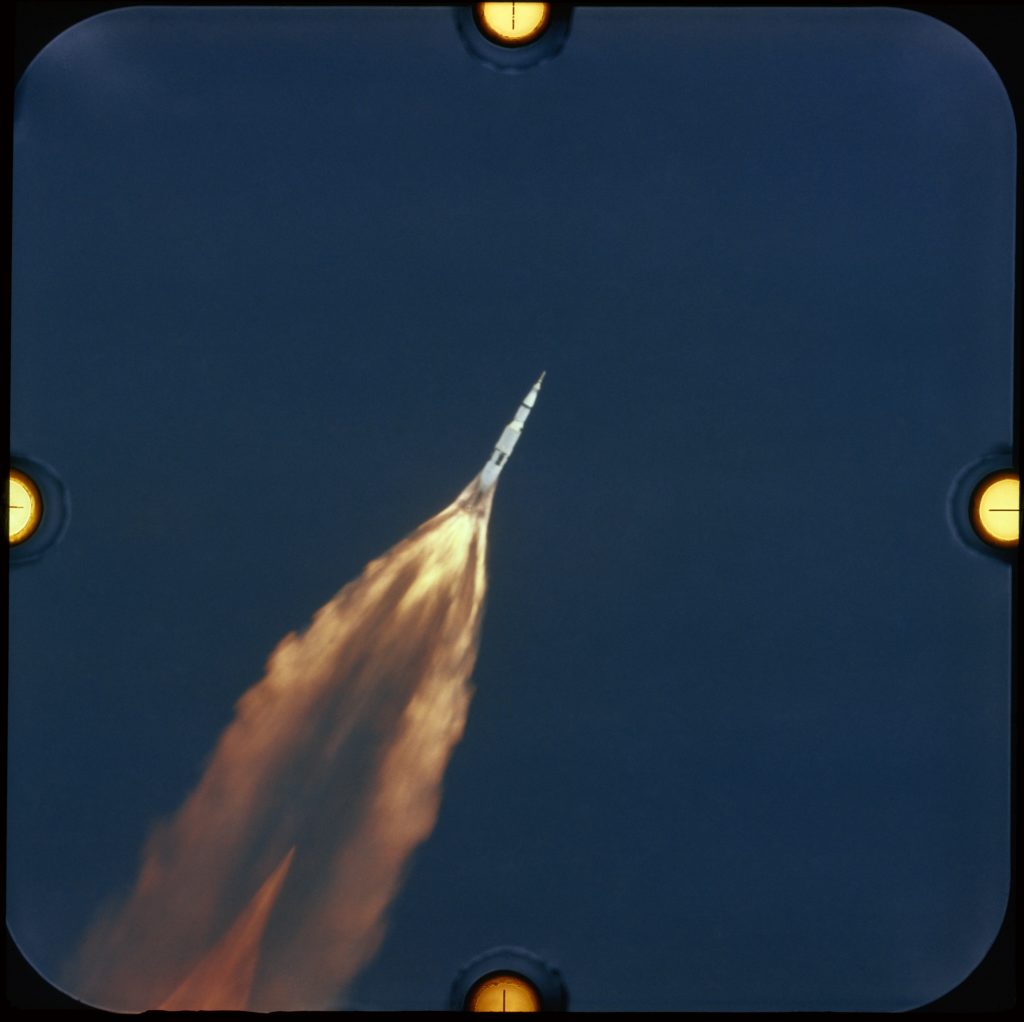 Apollo ll’s ascent from earth trails a rooster tail of flame. (NASA)