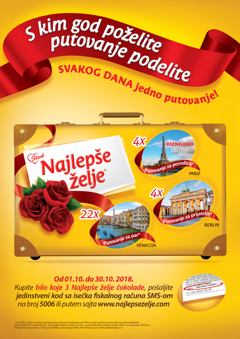 Više od 90 godina Najlepše želje sinonim su za slatke namere i prijatna iznenađenja za naše najdraže. Ima li šta lepše od toga da vam voljena osoba kaže: „Pakuj se, vodim te na put“? Velika nagradna igra S kim god poželite, putovanje podelite počinje već 1. oktobra!