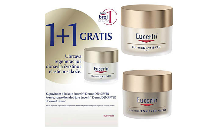Ako želite da ojačate strukturu svoje kože, da obnovite njenu elastičnost i učinite je čvršćom, da ublažite bore i poboljšate ukupni izgled svoje kože, vaš izbor su dnevna i noćna krema iz linije Eucerin DermoDENSIFYER. Tim pre što sada kupovinom bilo koje kreme iz Eucerin DermoDENSIFYER linije na poklon dobijate Eucerin DermoDENSIFYER dnevnu kremu! Akcija se ne odnosi se na promotivna pakovanja i već snižene artikle, a traje dok traju zalihe.