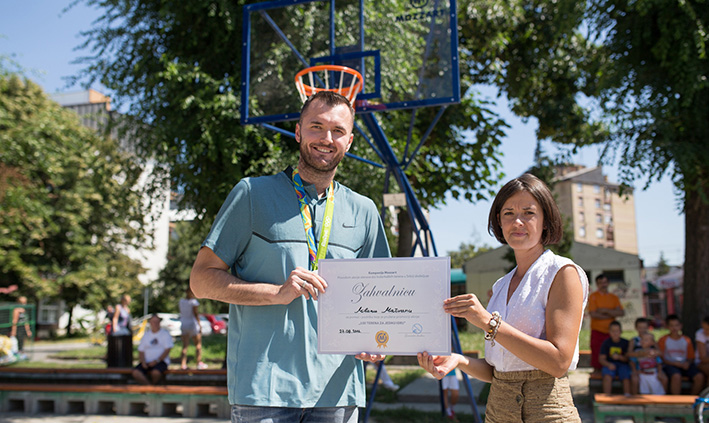 Mačvanu je prilikom otvaranja terena uručena i zahvalnica na podršci akciji a krilni centar reprezentacije i Olimpije iz Milana sa lakoćom je postigao i prvi pogodak na novim koševima.