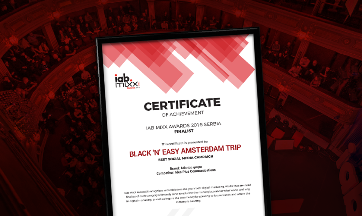 Navedeni uspeh i zadovoljstvo pratilaca na društvenim mrežama, plasirali su Black’n’Easy Amsterdam Trip konkurs u samo finale jedinog globalnog marketinškog takmičenja u zemlji i regionu, i inspirisali na nastavak Black’n’Easy avantura za ljubitelje kafe nove generacije.