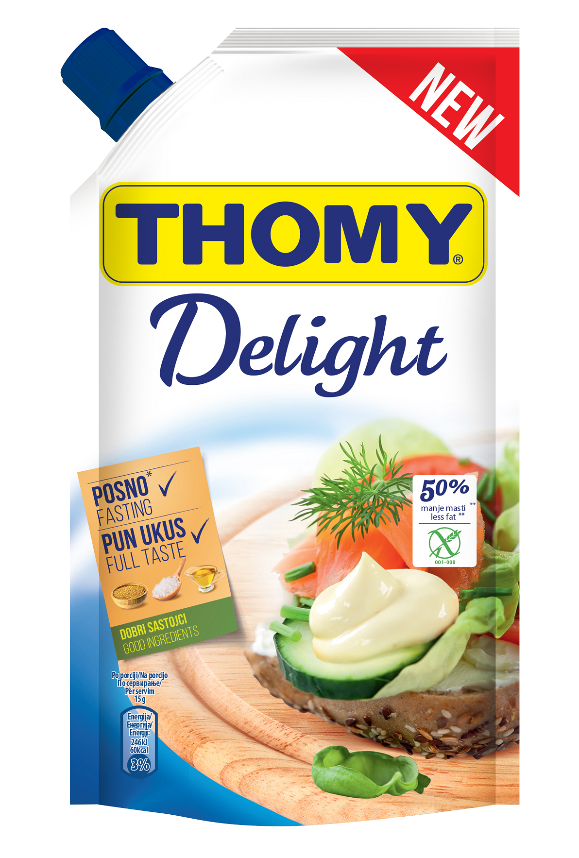 Kompanija Nestlé proširila je THOMY asortiman novim posnim Delight laganim majonezom bez glutena, napravljenim od pažljivo odabranih sastojaka koji stvaraju prepoznatljivu teksturu i pun ukus. U odnosu na klasičan THOMY majonez, Delight ima 50 % manje masti i 47 % manje kalorija.