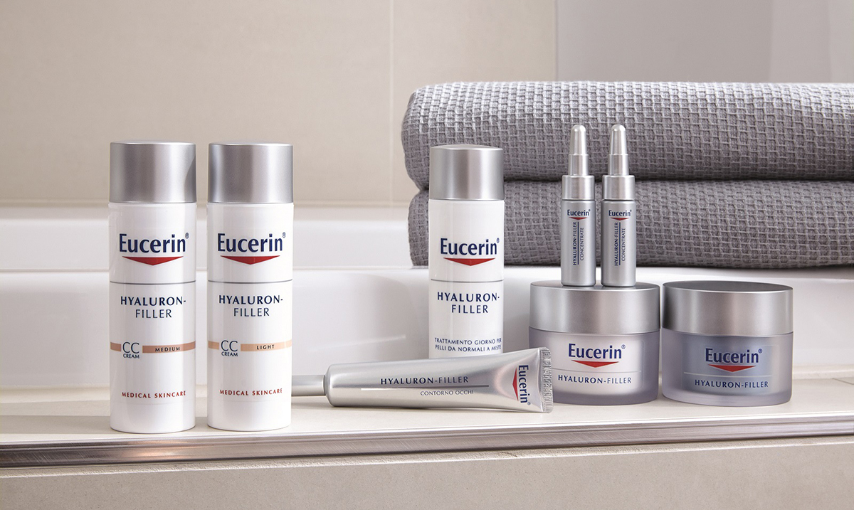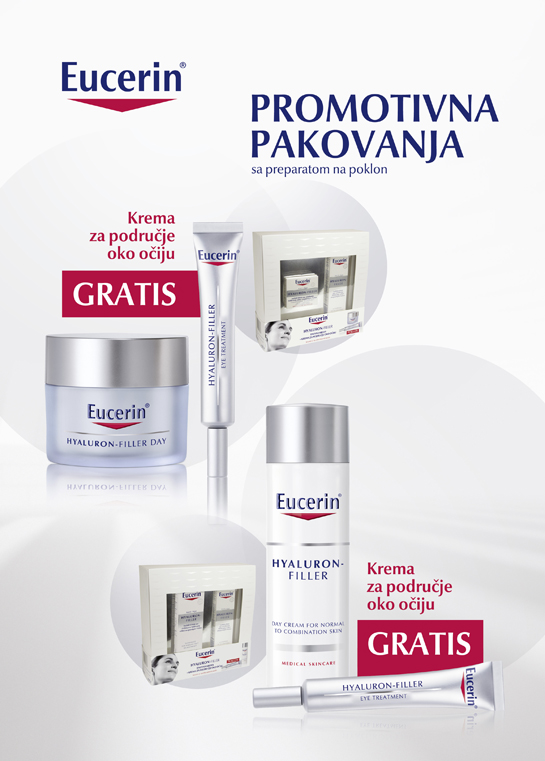 Efikasnost Eucerin® Hyaluron–Filler linije počiva na osobini hijaluronske kiseline da vezuje velike količine vode i time popunjava bore i daje koži mladalačku jedrinu. Ali, to nije sve. U svojim Hyaluron–Filler preparatima Eucerin® koristi autentičnu kombinaciju hijaluronske kiseline dugog i kratkog lanca, koja ovim preparatima daje moć da hidriraju kožu i bore se protiv starenja kože na površini, gde se simptomi uočavaju, ali i duboko u koži, gde proces starenja započinje.