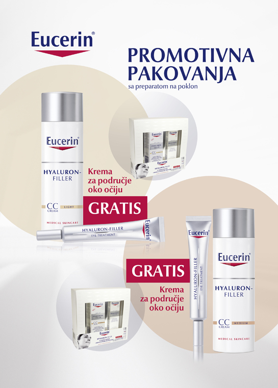 Eucerin® HYALURON-FILLER CC kreme SPF 15 obezbeđuju borbu protiv simptoma starenja, hidrataciju I ujednačavaju ten pomažući da se značajno umanje vidljivi znaci starenja.  Dolaze u svetlijoj i tamnijoj nijansi, mogu zameniti upotrebu tečnog pudera, a zahvaljujući blagoj pigmentaciji otklonjena je i opasnost od neprijatne razlike između tona lica i vrata, koja se može pojaviti kada koristite šminku.