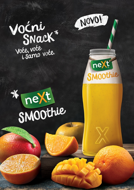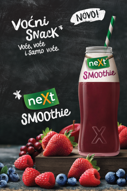 Porodica neXt sokova od danas je bogatija za još jednog člana, neXt Smoothie – pametni voćni snack, pripremljen od mešavine više vrsta voća! U svom sastavu nema dodatu vodu, šećer kao ni arome. Uz to odlikuje ga bogat ukus, gustina i osećaj sitosti koji pruža nakon konzumiranja.