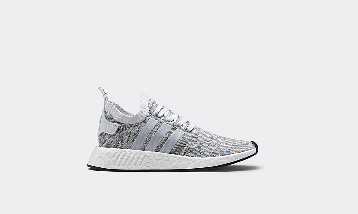 NMD_R2 PK model objedinjuje futuristički dizajn patike sa širokim spektrom komplementarnih grafičkih detalja. Primeknit gornjište u sivoj boji ističe siluetu patike, dok jedinstvena „shadow knit” tehnika stvara utisak da patika menja boju u zavisnosti od svetla. Izgled je upotpunjen pertlama u istoj boji, kao i kožnim ojačanjem za petu i BOOST središnjim đonom u koji je dodata asimetrično EVA pena.