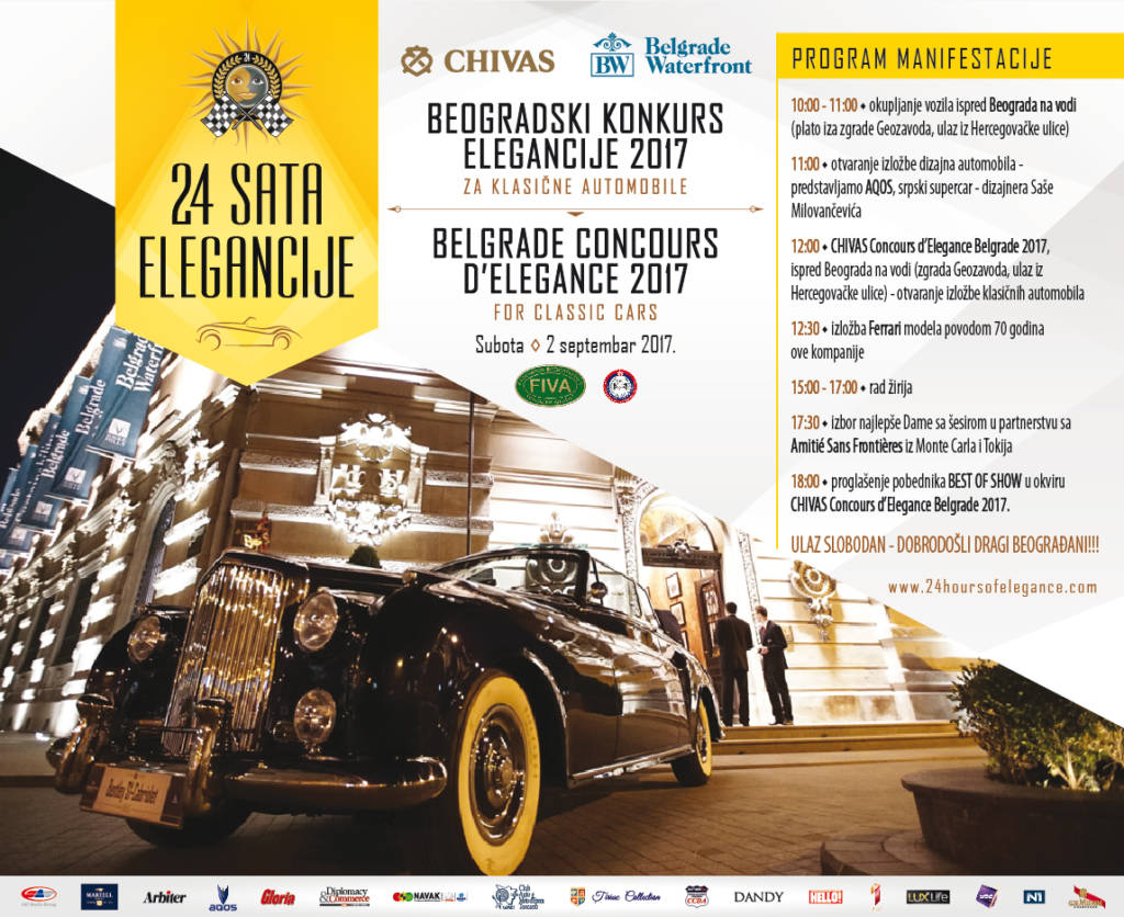 Po 7. put u Beogradu, u okviru manifestacije CHIVAS 24 sata Elegancije (www.24hoursofelegance.com), subota 2. septembar je u znaku „Beograd Classic Car Show-a 2017” pod pokroviteljstvom Beograda na Vodi,  na kojem predstavljamo zvezde među automobilima u vlasništvu najpoznatijih svetskih i domaćih kolekcionara, a takođe ćete imati priliku da čujete, vidite, dodirnete neke od najcenjenijih luksuznih brendova današnjice, ali i da upoznate i popričate sa njihovim kreatorima, onima koji čine onu ekskluzivnu nišu namenjenu najzahtevnijim klijentima.