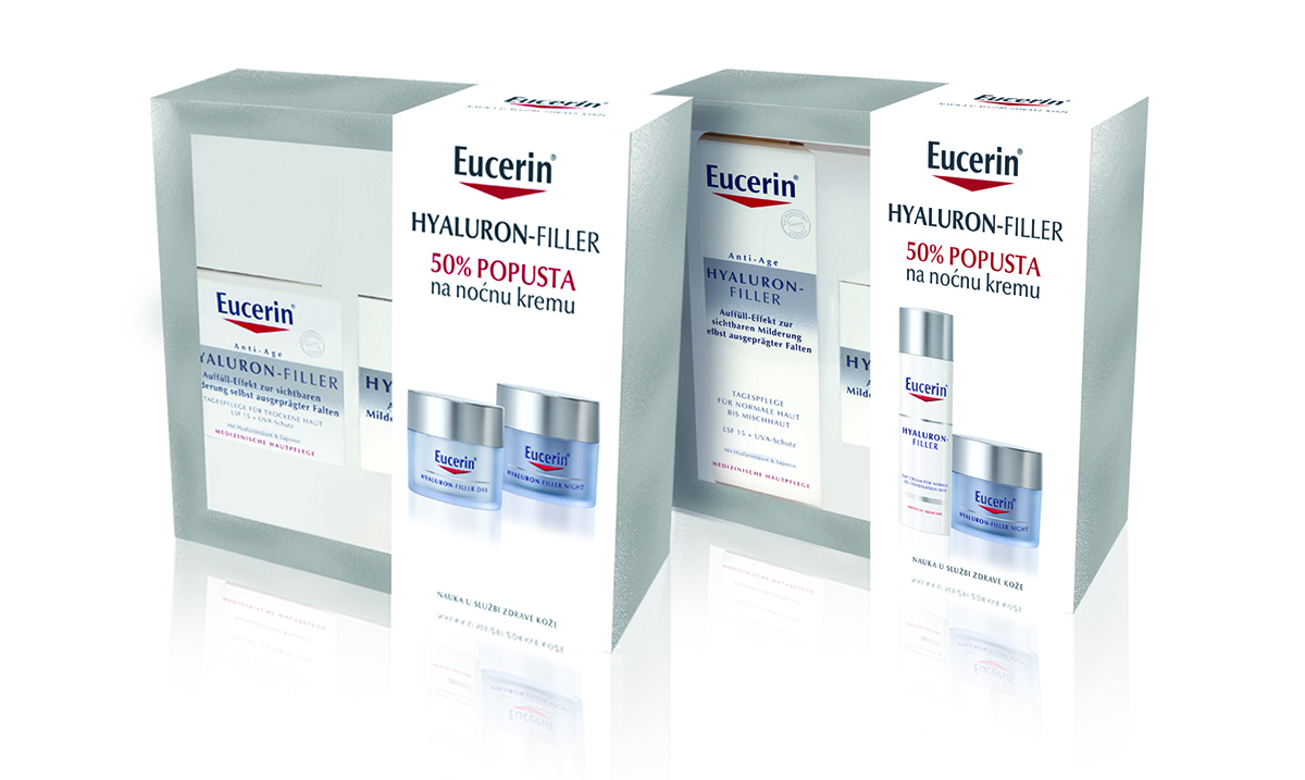 Eucerin® Hyaluron-Filler linija obuhvata preparate neophodne za kompletnu dnevnu, noćnu i dodatnu antiage negu. Eucerin® Hyaluron-Filler dnevne kreme, jedna namenjena suvoj, a druga normalnoj i kombinovanoj koži, imaju laganu teksturu i odlična su podloga za šminku, a sadrže i SPF 15 i UVA zaštitu. To znači da, pored hidratacije i borbe protiv starenja, pružaju koži i zaštitu od negativnih efekata sunčevog zračenja. Ove kreme sada se mogu pronaći u specijalnom pakovanju sa Eucerin® Hyaluron-Filler noćnom kremom za sve tipove kože, po posebnim uslovima kupovine – popustom od 50 odsto na noćnu kremu.