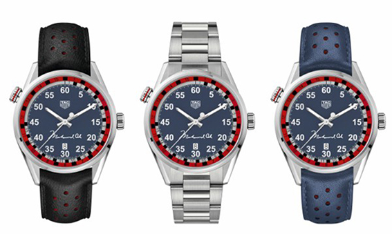 TAG Heuer Carrera Muhammad Ali specijalna edicija je u stvari reizdanje prve kolekcije posvećene slavnom sportisti koja je lansirana 2016. od strane TAG Heuer brenda. Inspirisan je Ring Master štopericom koja je svetu predstavljena 1957. godine, a sada se nalazi u TAG Heuer muzeju. Ring Master je sadržala 7 prstenova, svaka sa drugom skalom uključujući i jednu boksersku. Carrera Muhamed Ali poseduje kućište od nerđajućeg čelika prečnika 43 mm sa dve krunice-jednu na poziciji 3 sata koja je za podešavanje vremena, i drugu koja se nalazi na poziciji 10 sati, a koja rotira unutrašnju masku. Na pozadini kućišta je ugraviran lik Muhameda Alija kao i njegov potpis. Postoje dve boje na brojčaniku-crveni koji tradicionalno označavaju bokserske borbe u teškoj kategoriji-15 rundi od po 3 minute i krem obojeni markeri koji se odnose na amaterski boks u kom runde traju 2 minute. I crveni kao i krem markeri, imaju po minut prekida koji je obojen crnom bojom.