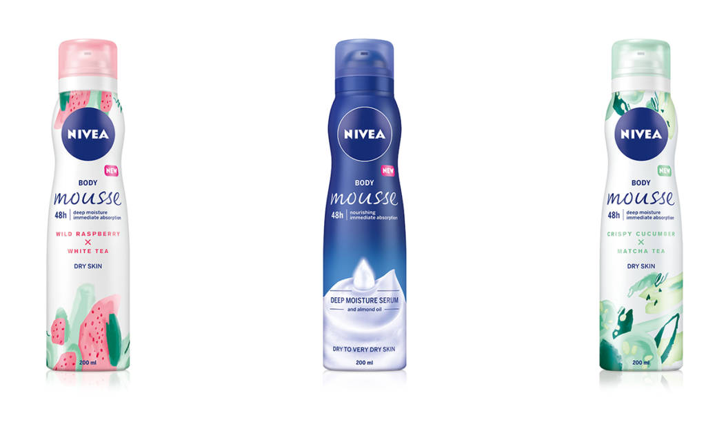 NIVEA predstavlja tri jedinstvene pene za negu tela. NIVEA Nourishing pena za negu tela za suvu i veoma suvu kožu sadrži NIVEA serum za intenzivnu hidrataciju. Obogaćena jedinstvenim NIVEA mirisom, ova pena je savršen izbor ukoliko uživate u prefinjenim notama koje odišu negom i toplinom. Za one koji više vole nove mirise i pakovanje zanimljivog, šarenog dizajna, stručnjak za negu kože nudi dva proizvoda inspirisana našim mirisima godine: NIVEA pena za negu tela sa mirisom divlje maline i belim čajem i NIVEA pena za negu tela sa mirisom svežeg krastavca i mača čajem, koje su pogodne za suvu kožu.