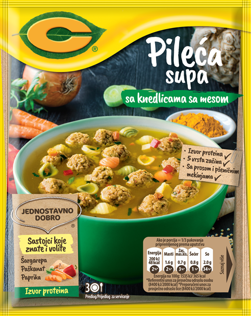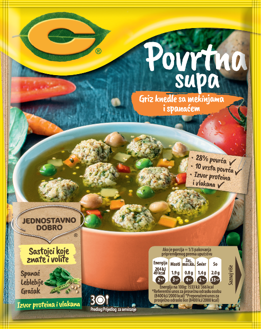 C Pileća supa sa knedlicama sa mesom predstavlja izvor proteina, sadrži pet vrsta začina (peršun, kurkuma, vlašac, mleveni crni biber, beli luk) i pastu u tri boje, dok C Povrtna supa sa griz knedlama sa mekinjama i spanaćem, pored izvora proteina, predstavlja i izvor vlakana i sadrži čak 28 odsto povrća.