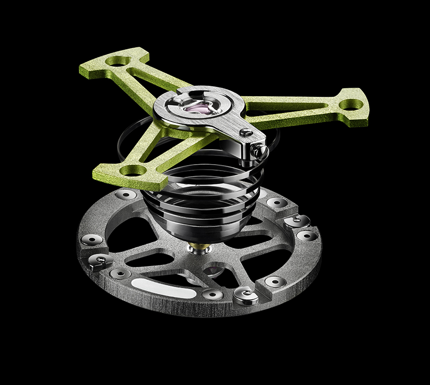 Uzorak se takođe može videti na oscilirajućoj masi, koja je obrađena sa crnim PVD premazom, a vidljiva je kroz safirnu zadnju stranu kućišta. Aludirajući na Haute časovničarstvo iz prošlosti, sjajna neonska zelena boja krasi razne elemente sata, uključujući i aluminijumski most i natpis na turbilon mehanizmu.