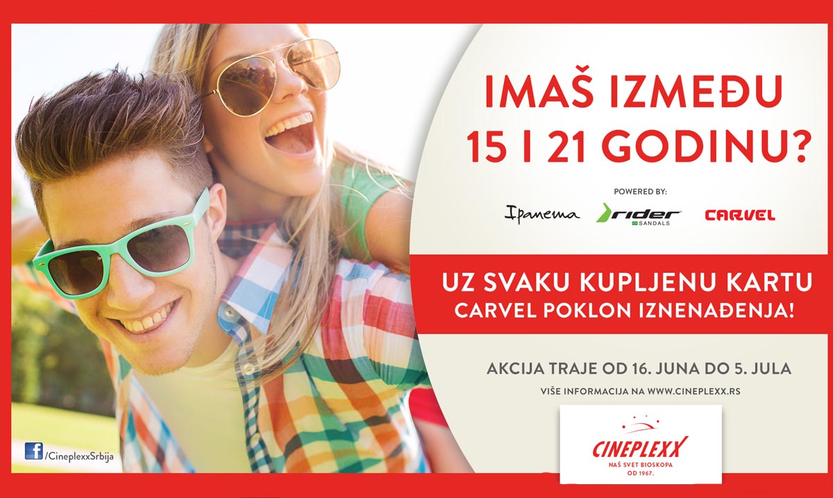 Ne zaboravi da te pored uživanja u filmu u bioskopu Cineplexx očekuje i neki od sjajnih poklona brenda Carvel, među kojima su vaučeri sa do 30% sniženja na Rider i Ipanema japanke. Dovoljno je samo da imaš između 15 i 21 godine!