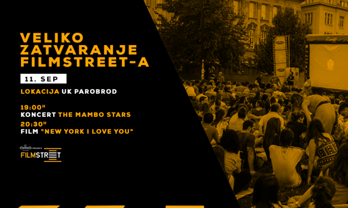 Filmstreet, najposećeniji kulturni letnji događaj završava ovogodišnju bioskopsku sezonu pod otvorenim nebom u nedelju, 11. septembra u 19 časova, ispred ustanove kulture Parobrod (ugao Kapetan Mišine i Jevremove ulice). Zatvaranje šestog ciklusa putujućeg bioskopa obeležiće koncert članova Big Benda RTS-a, „The Mambo Stars“, nakon čega će uslediti projekcija kultnog filmskog ostvarenja „New York, I love you“.