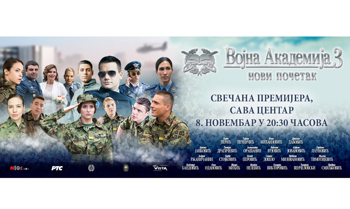 Film „Vojna akademija 3 – novi početak“ biće premijerno prikazan 8. novembra u Sava Centru, nakon čega će uslediti bioskopska distribucija širom Srbije, najavila je kuća „Art Vista“.