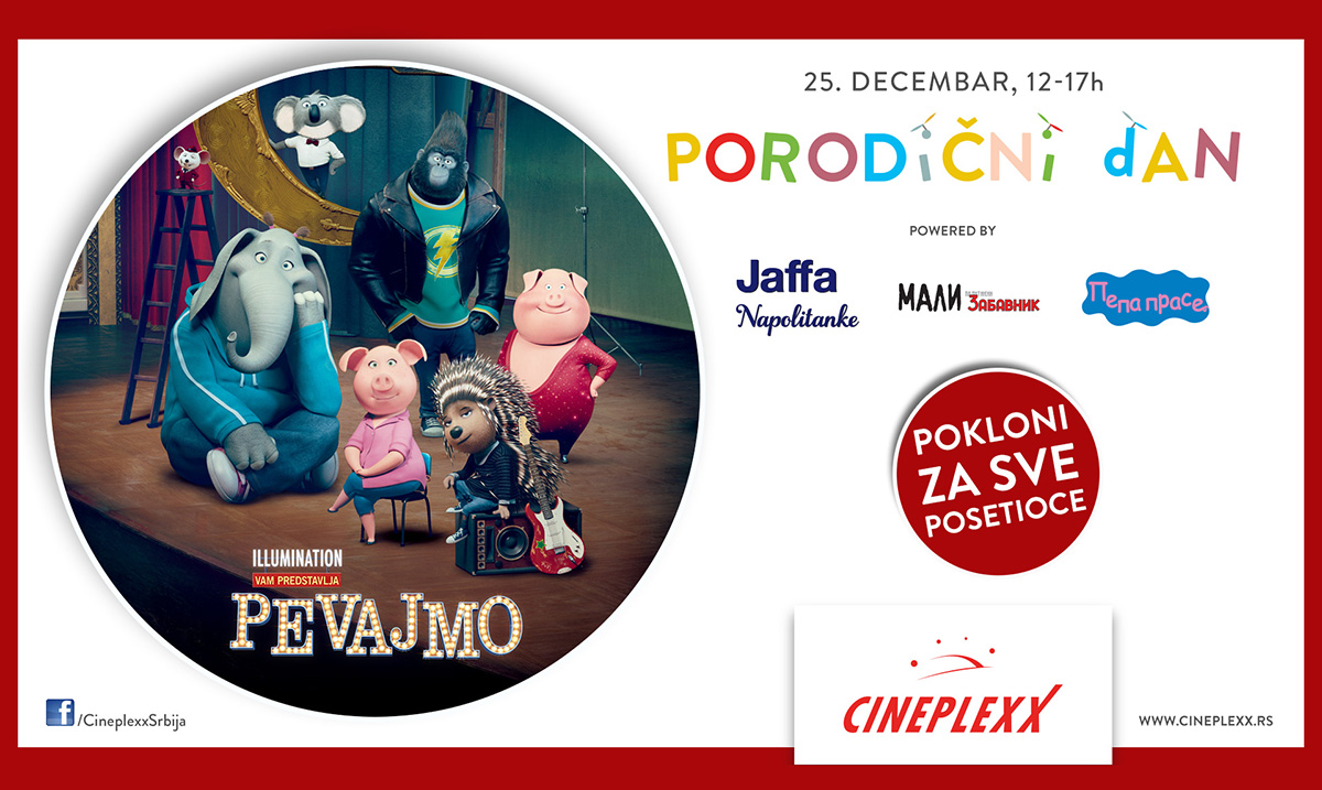 Pridružite nam se na još jednom Porodičnom danu u bioskopima Cineplexx Delta City i UŠĆE Shopping Center, koji će biti održan ove nedelje, 25. decembra, u periodu od 12 do 17 sati, uz prikazivanje najnovije animirane avanture„Pevajmo“.