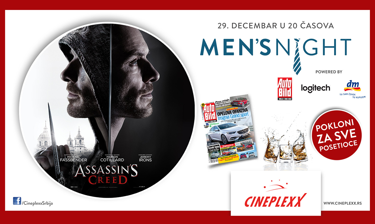 Men`s night događaj u bioskopima Cineplexx Delta City i UŠĆE Shopping Center, uz prikazivanje filma „Assassin`s Creed“, održaće se u četvrtak, 29. decembra, sa početkom u 20 časova.