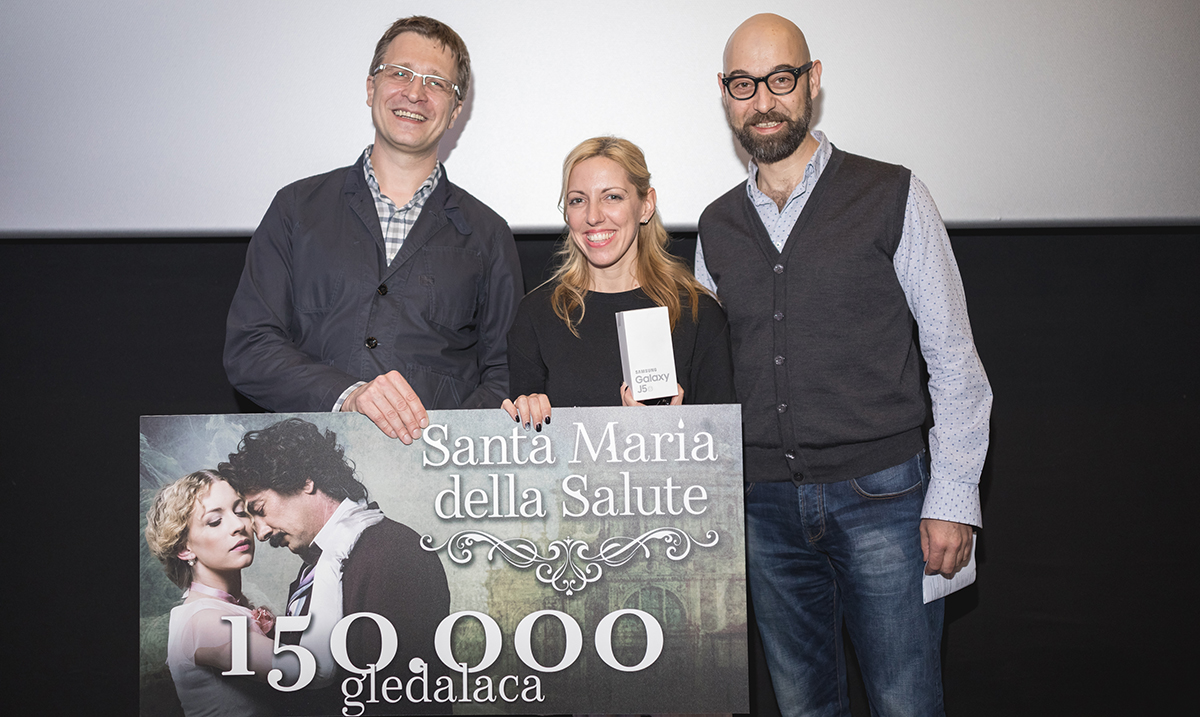 Film „Santa Maria della Salute“ scenariste i reditelja Zdravka Šotre, sinoć je na projekciji u novosadskom bioskopu “Arena Cineplex” proglasio 150.000 -og gledaoca – Aleksandru Spasić, kojoj je tom prilikom i dodeljen mobilni telefon sa dodatom muzikom iz ostvarenja, autora Vojkana Borisavljevića.