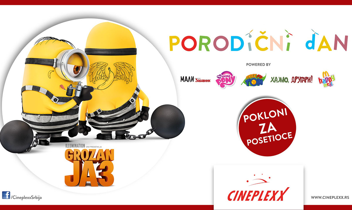 Još jedno druženje za sve mališane uz fantastičnu filmsku avanturu „Grozan ja 3” zakazano je za nedelju 2. jul od 12 do 17 časova u bioskopima Cineplexx UŠĆE Shopping Center, Cineplexx Delta City, Cineplexx BIG Beograd i Cineplexx Kragujevac Plaza, dok će u bioskopu Cineplexx Niš u Stop Shop ritejl parku, druženje biti oba dana vikenda, 1. i 2. jula od 12 do 17 časova. Cineplexx Porodični dan uz najaktuelnije filmove i odličnu zabavu očekuje sve mališane.
