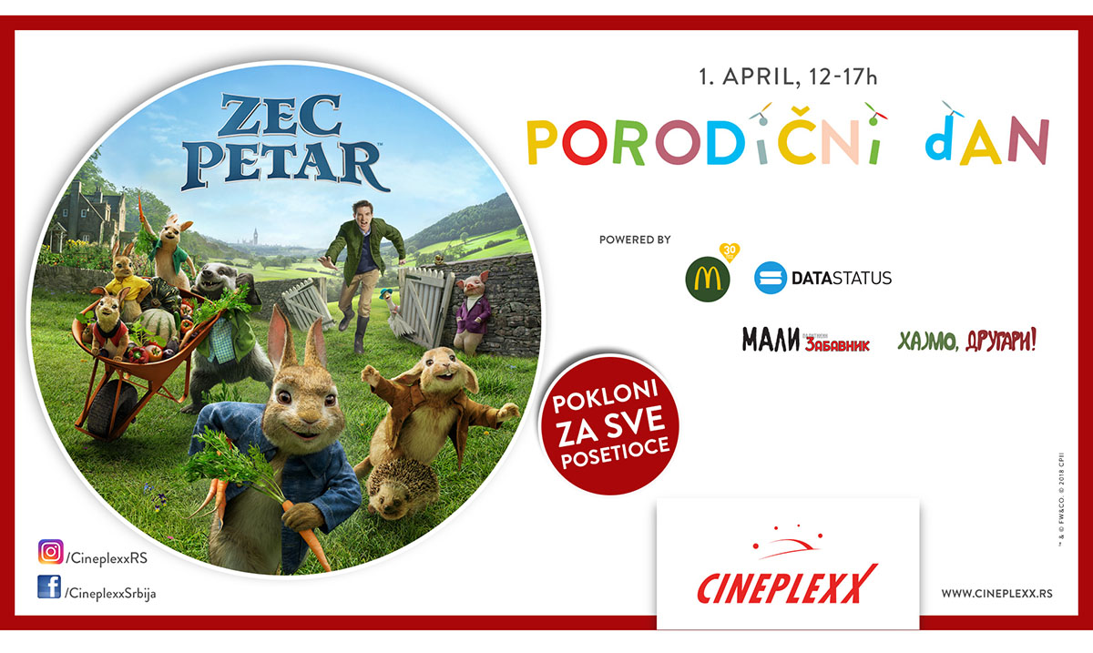 Najbolji način da obeležimo Dan šale u bioskopima Cineplexx su nezaboravne avanture Zeca Petra i njegove družine, na Porodičnom danu, zakazanom za nedelju 1. april od 12 do 17 časova! Ne propustite priliku da se zabavite uz kreativne radionice inspirisane vragolastim Zecom Petrom i poklone koje smo pripremili za sve mališane! Karte su uveliko u prodaji na blagajnama bioskopa Cineplexx!