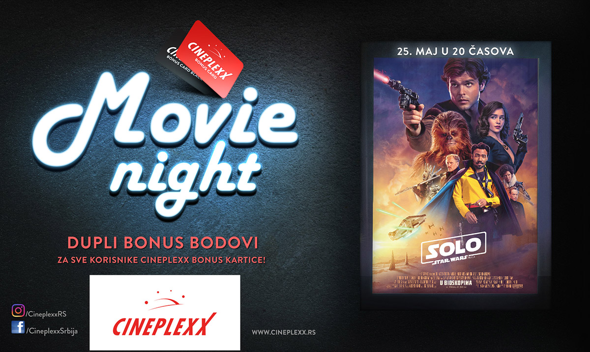 Za sve korisnike Cineplexx bonus kartice i one koji to žele da postanu, pripremili smo još jedan Movie night na kojem nagrađujemo vašu vernost! U petak, 25. maja na specijalnoj projekciji filma „Solo – Star Wars priča“od 20 časova članove Cineplexx bonus kluba očekuju dupli bodovi za kupljene ulaznice, kao i brze kase, za specijalni filmski užitak. Karte za Movie night su uveliko u prodaji na blagajnama bioskopa Cineplexx.