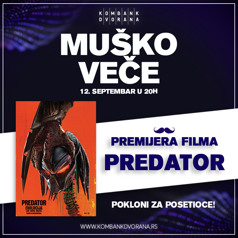 U sredu, 12. septembra u 20h u Kombank dvorani biće premijerno prikazana nova verzija franšize Predator: Evolucija. Uz svaku kupljenu ulaznicu, gledaoci će na poklon dobiti energetsko piće!