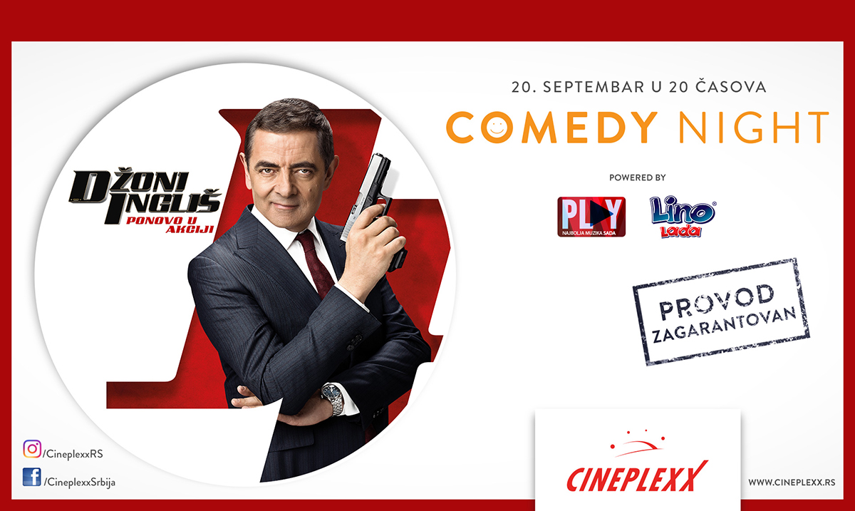 Ukoliko niste, upoznajte Džonija Ingliša u urnebesnom izdanju ovog četvrtka u bioskopimaCineplexx BIG Beograd, Delta City, UŠĆE Shopping Center, Kragujevac Plaza i Cineplexx Niš od 20 časova! Veče puno smeha, kakvo samo Rouan Etkinson može da priredi očekuje vas na Comedy night događaju uz film “Džoni Ingliš – Ponovo u akciji”! Karte su od sutra u prodaji na blagajnama bioskopa!