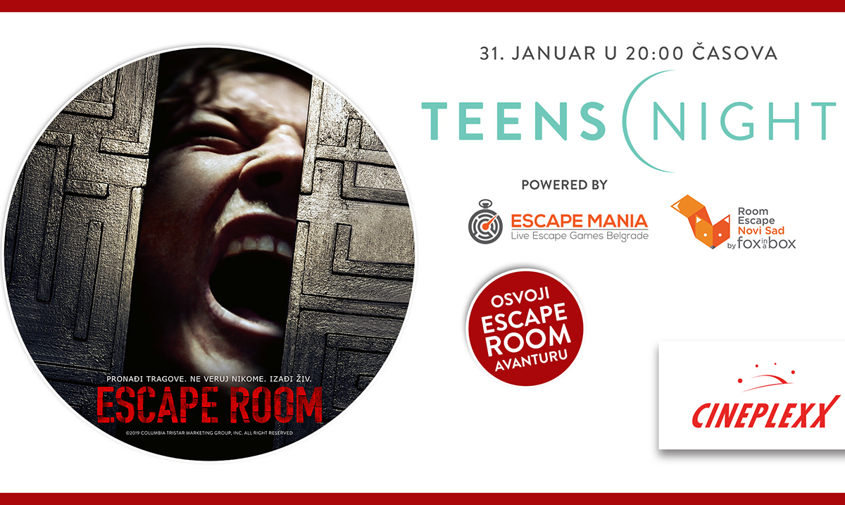 Triler „Escape Room“ dolazi na veliko platno bioskopa Cineplexx UŠĆE Shopping Center, Cineplexx 4D Delta City, Cineplexx BIG Beograd, Cineplexx Promenada, Niš i Kragujevac Plaza i to u okviruTeens night događaja zakazanog za četvrtak, 31. januar od 20 časova. Karte su već u prodaji na blagajni bioskopa.