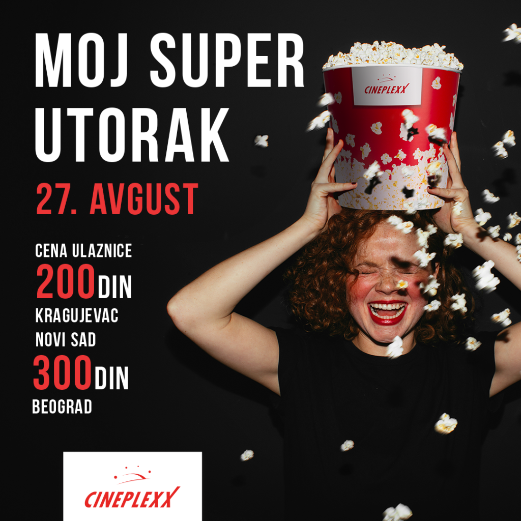 Bioskopi Cineplexx obradovaće svoju publiku u utorak, 27. avgusta, kada će svi naslovi moći da se pogledaju po ceni od 300* dinara u Beogradu i 200* dinara u Kragujevcu i Novom Sadu! Karte su u prodaji!