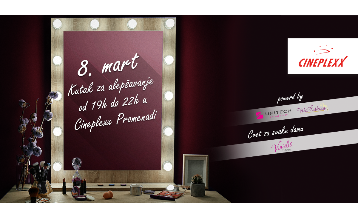 U nedelju, 8. marta, u periodu od 19h do 22h, u kutku za ulepšavanje u holu bioskopa, Unitech Hair & Beauty pobrinuće se da vaša kosa zasija punim sjajem, Studio Vila Četkica biće zadužen za vašu savršenu šminku,  a cvećara Viridis Flowers svaku damu će obradovati prelepim cvetom! Pred projekciju filma “K’o šef” od 20:50h najsrećnije očekuju poklon vaučeri za venčanja od foto studija Pixels.