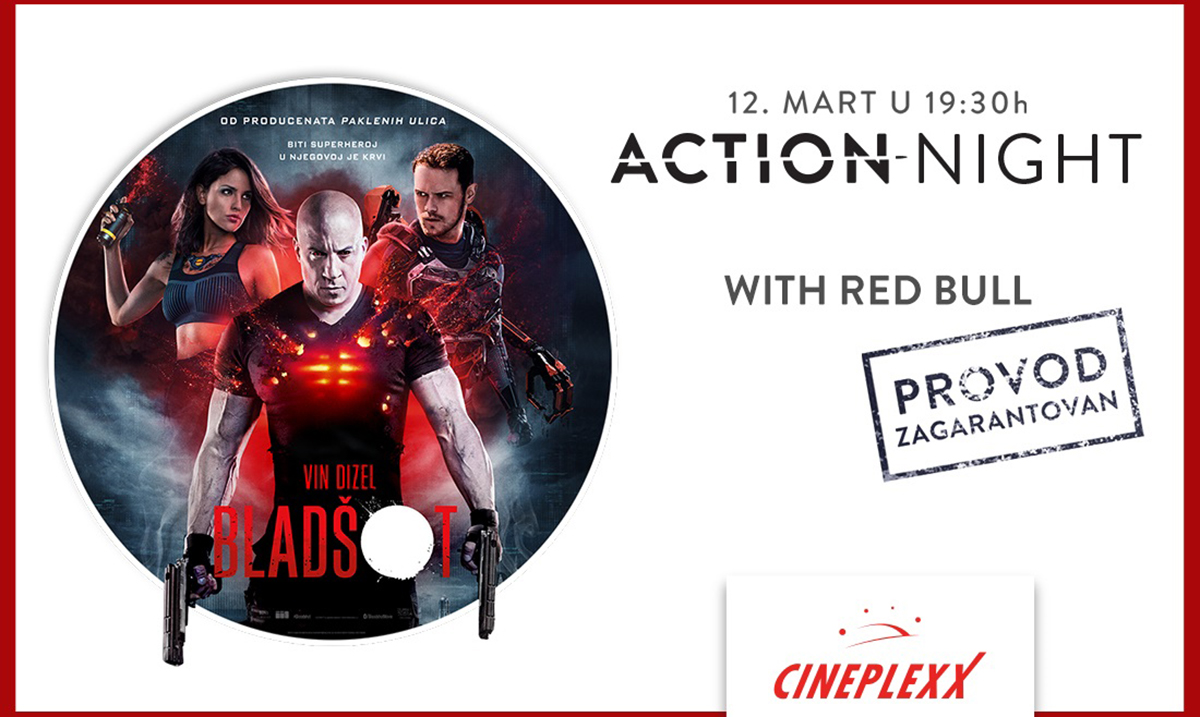 U četvrtak, 12. marta, od 19:30 časova, Action night događaj donosi film ,,Bladšot” . U Cineplexx bioskopima biće uzavrela atmosfera, a tome će doprineti i Red Bull, koji će posetiocima CIneplexx bioskopa dati dodatnu energiju da se udube u ovu uzbudljivu akciju.