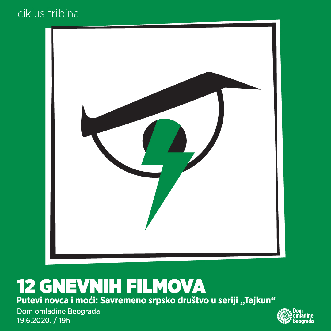 Treća u okviru ciklusa „12 gnevnih filmova“, „Putevi novca i moći: Savremeno srpsko društvo u seriji Tajkun“, biće održana u petak, 19. juna 2020. godine, sa početkom u 19 časova, u prostoru ispred sale „Amerikana“. Učestvuju reditelj Miroslav Miša Terzić i scenarista Đorđe Milosavljević, tribinu vode: Zoran Janković i Đorđe Bajić. Programi u Domu omladine Beograda se održavaju uz primenu svih mera zaštite koje su propisane od strane stručnih službi i nadležnih organa. Posetioci se mole da takođe poštuju propisane mere i budu odgovorni prema sebi i drugima. Ulaz na tribinu je slobodan.