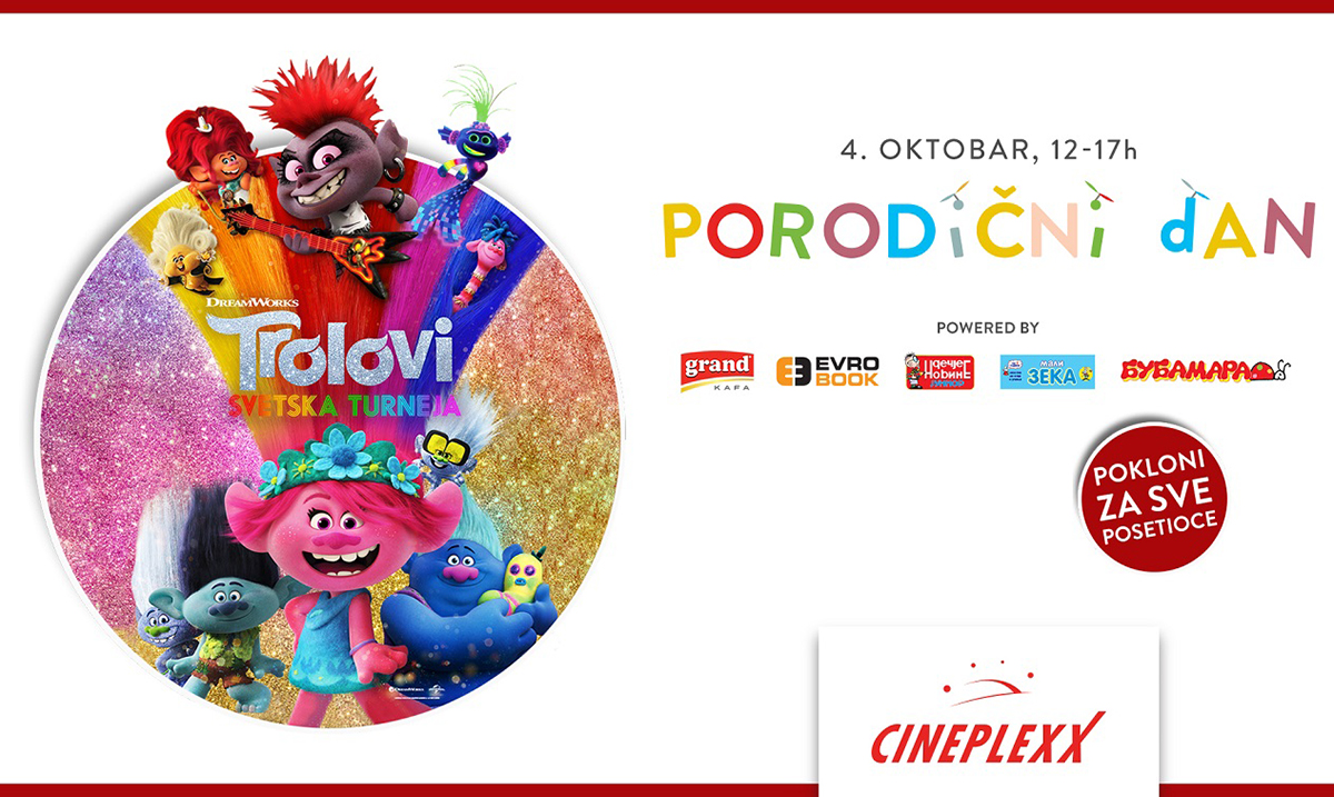 Nastavak avanture koja nas je pre četiri godine očarala konačno je stigao, a mi vas pozivamo na Porodični dan uz film ,,Trolovi: Svetska turneja” u Cineplexx bioskopima, u nedelju 4. oktobra od 12 do 17 časova. Pokloni iznenađenja i mnogo zabave na kreativnim radionoicama očekuju sve posetioce.
