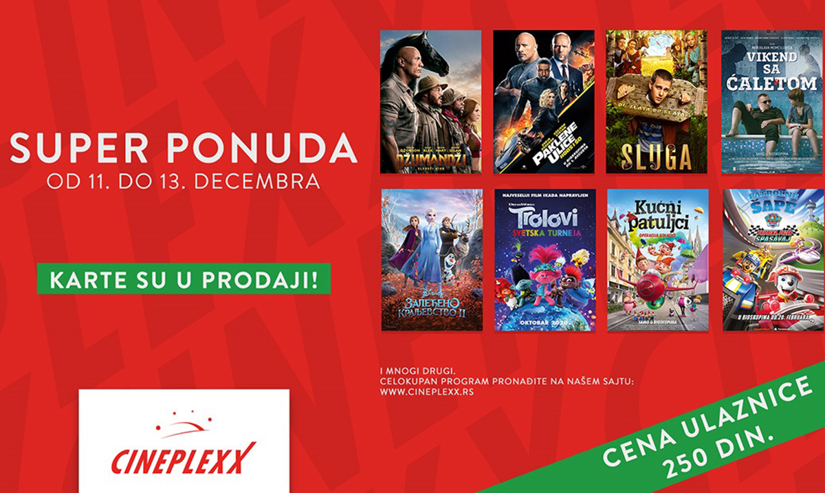 Da li ste znali da su Cineplexx bioskopi u okviru tržnih centara otvoreni ovog petka i vikenda? Ljubitelje sedme umetnosti od 11. do 13. decembra očekuje snižena cena ulaznica od 250 dinara za sve filmove na repertoaru. Ali to nije sve! Najnoviji Cineplexx Galerija Belgrade bioskop će raditi već od četvrtka, 10. decembra do nedelje 13. decembra gde sve posetioce očekuje 1+1 akcija – uz već sniženu cenu ulaznica od 250 dinara, na jednu kupljenu ulaznicu druga se dobija gratis. Karte su u prodaji.