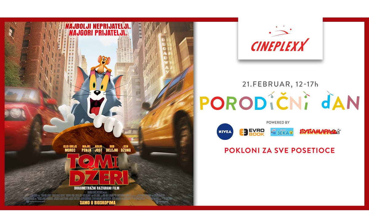Porodični dan u uz sinhronizovanu animiranu avanturu ,,Tom i Džeri” u Cineplexx bioskopima, zakazan je za nedelju, 21. februar od 12 do 17 časova, uz poklone za naše najmlađe posetioce i mnogo zabave uz avanture naših omiljenih crtanih junaka.