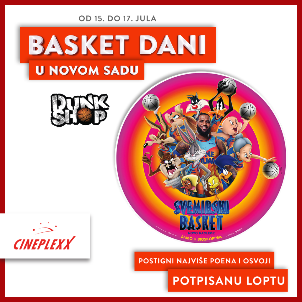 Basket dani u Cineplexx Promenadi trajaće od 15. do 17. jula od 19 do 20 časova kada će svakog dana onaj ko postigne najviše poena poneti sa sobom loptu potpisanu od strane čuvenog košarkaša ili basketaša, a koju su obezbedili prijatelji bioskopa iz Dunk Shop Srbija. Karte za “Svemirski basket: Novo nasleđe” su u prodaji, a broj igrača je ograničen!
