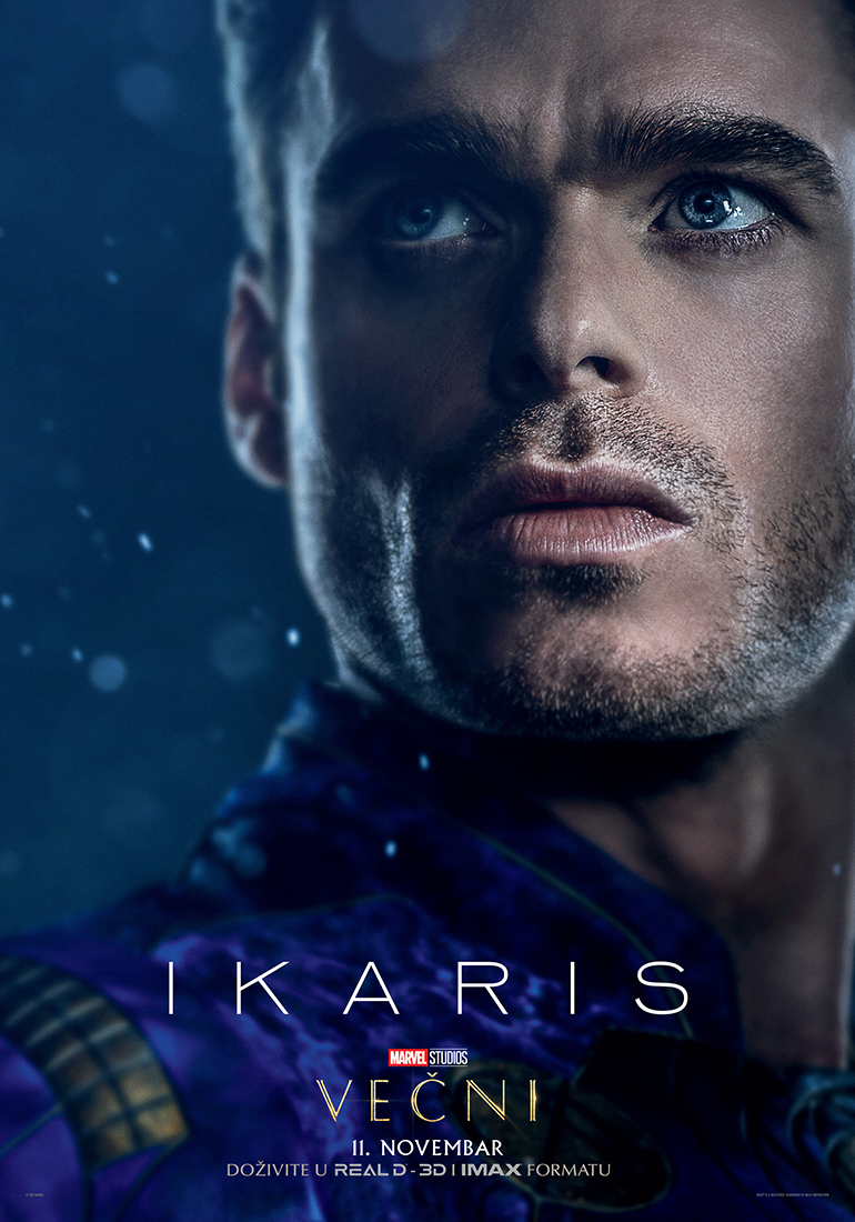 Ikaris je borac koji ima natprirodnu moć i neverovatnu snagu. Njegova kosmička energija mu dozvoljava da leti i ispaljuje laserske zrake iz očiju. Stoji iza svega što Večni rade i veoma je fokusiran. Glumac Ričard Maden, poznat po čuvenoj seriji „Igri prestola“- i još čuvenijoj epizodi Crvenom venčanju, o ulozi superheroja Ikarisa rekao je: „Bilo je prelepo snimati na pravim lokacijama, a ne na zelenim i plavim ekranima. Imamo sjajne scene na plažama sa crnim peskom i vulkanskim ostrvima. Ulice Londona, krajolik šuma, sve je to doprinelo da uzemljimo priču i učinimo je realnijom„.