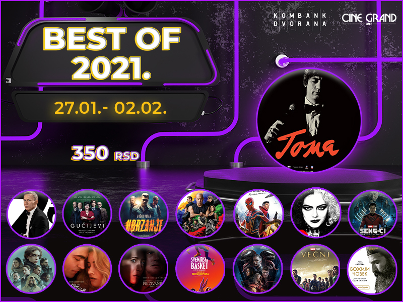 Tako će po tradiciji koja traje od 2018. u Kombank Dvorani,  a koja se ove godine i nastavlja u bioskopu Kombank Dvorana, ali i Cine grand-u,  od četvrtka 27. januara do 2. februara biti održana akcija BEST OF 2021. a specijalna cena filmova za ovu priliku biće od svega 350 dinara za sve najgledanije filmove iz 2021. godine.