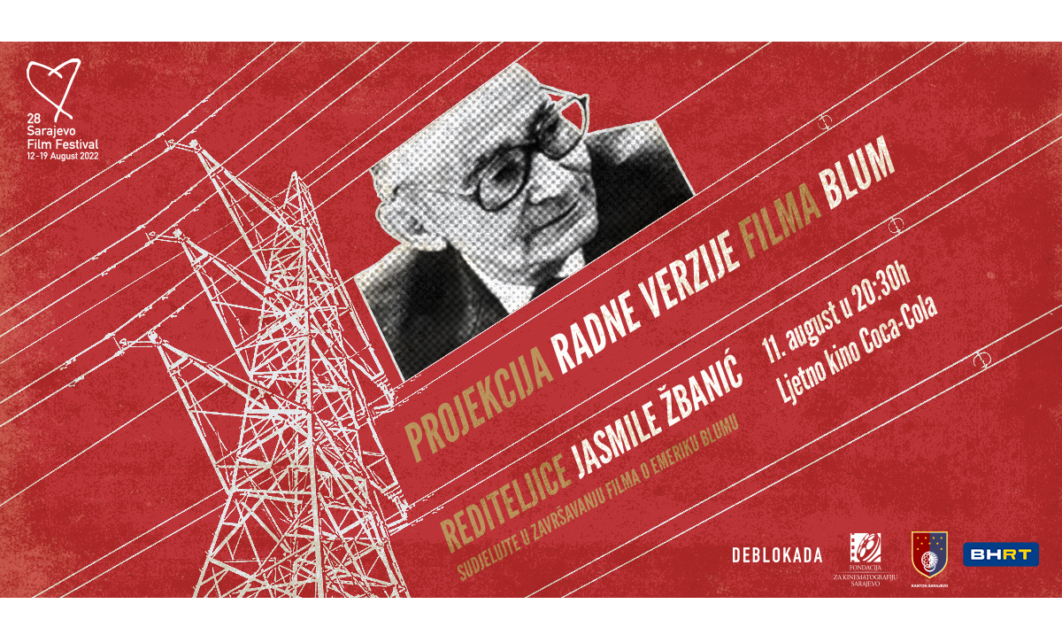 Sarajevo Film Festival ove će godine dan prije svečanog otvorenja Festivala, u četvrtak, 11. augusta u 20.30 sati u Ljetnom kinu Coca-Cola, upriličiti specijalnu predfestivalsku projekciju radne verzije filma o Emeriku Blumu Jasmile Žbanić. Ulaz na projekciju je besplatan.