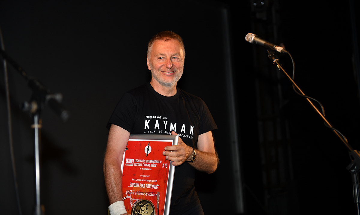Goran Cvetanović uručio je nagradu “Živojin Žika Pavlović” ovogodišnjem laureatu, reditelju Milču Mančevskom, koga je publika nagradila burnim ovacijama.