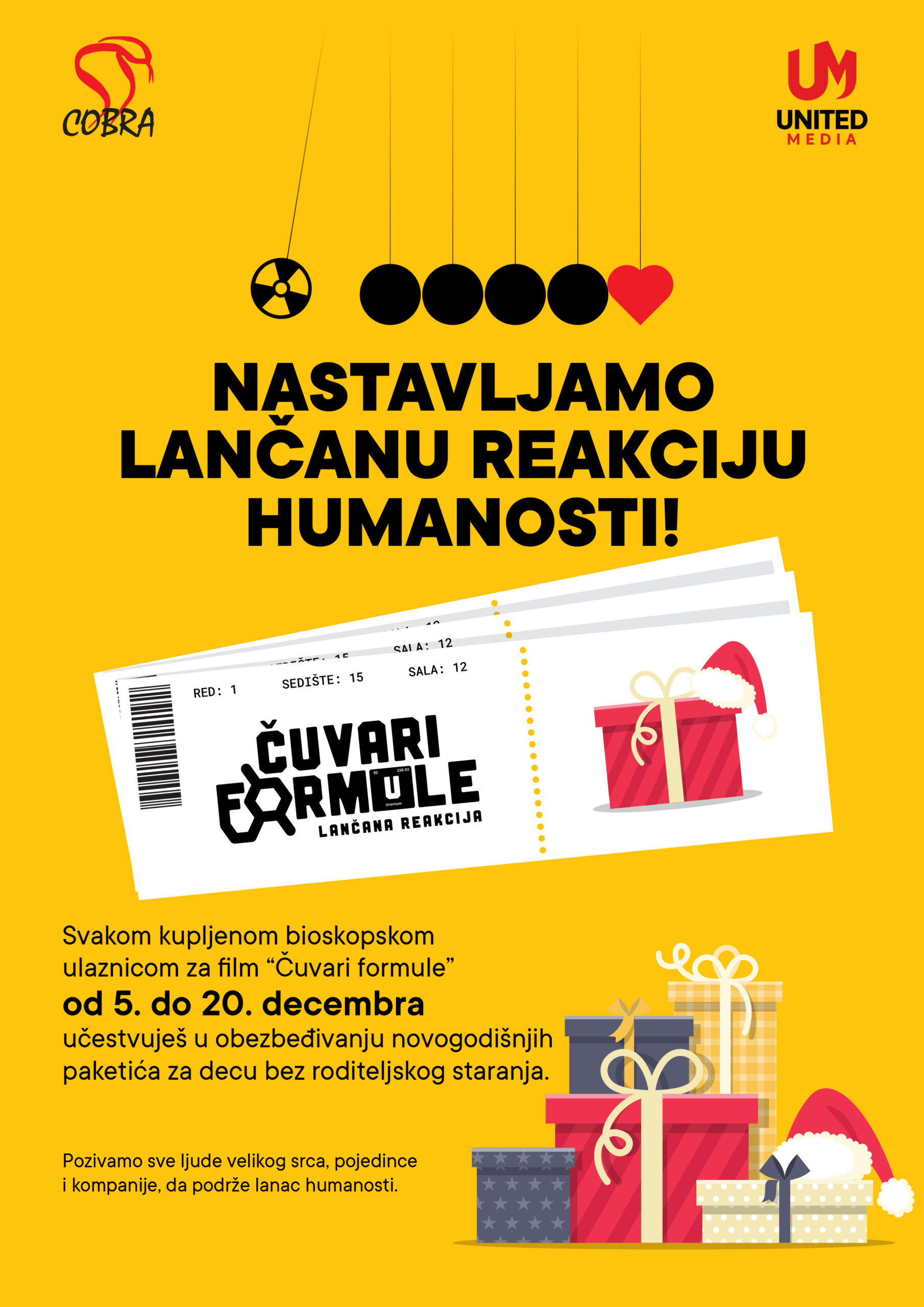Ekipa filma „Čuvari formule“ nastavlja lančanu reakciju humanosti i poziva sve ljude velikog srca, pojedince i kompanije, da se pridruže ovoj kampanji. Od 5. do 20. decambra novac od svake kupljene bioskopske ulaznice biće namenjen za nabavku novogodišnjih paketića deci bez roditeljskog staranja u domovima u Beogradu, Novom Sadu i Nišu.