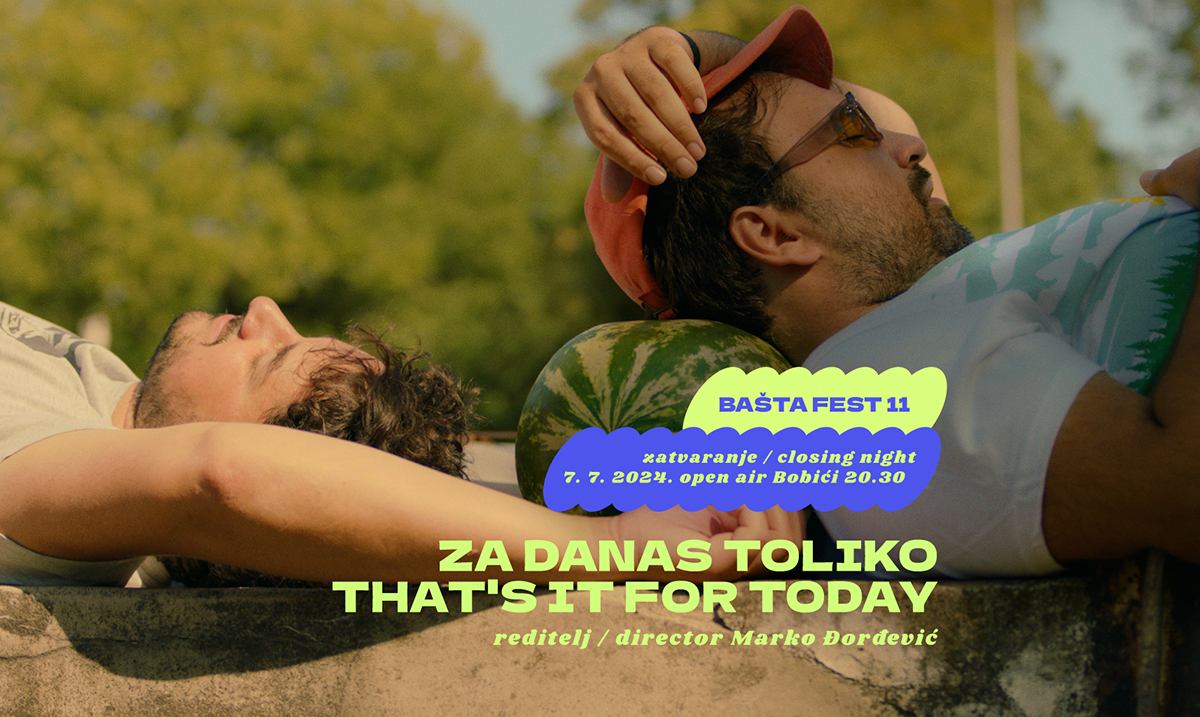 U nedelju 7. jula, u okviru revijalnog programa 11. Bašta Fasta, na Open air sceni u parku “Borići” publika će imati priliku da pogleda film “Za danas toliko” reditelja Marka Đorđevića, koji će nakon projekcije zatvoriti festival.