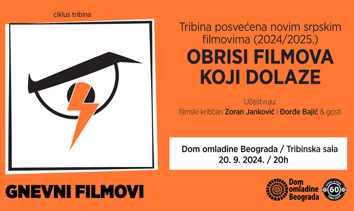 Nakon letnje pauze, u Domu omladine Beograda se nastavlja ciklus tribina „Gnevni filmovi“ koji uređuju i moderiraju filmski kritičari Zoran Janković i Đorđe Bajić. Septembarska tribina, trideset i sedma po redu, biće posvećena novim srpskim filmovima koji pred publiku stižu do kraja 2024. i početkom 2025. godine. Tribina pod naslovom „Obrisi filmova koji dolaze“ biće održana u petak, 20. septembra 2024. godine, s početkom u 20 časova, u Tribinskoj sali Doma omladine Beograda. Gost Bajića i Jankovića biće Nikola Jović, filmski kritičar časopisa „Kinoteka“, portala Eye For Film i Before/After. Ulaz na tribinu je besplatan.