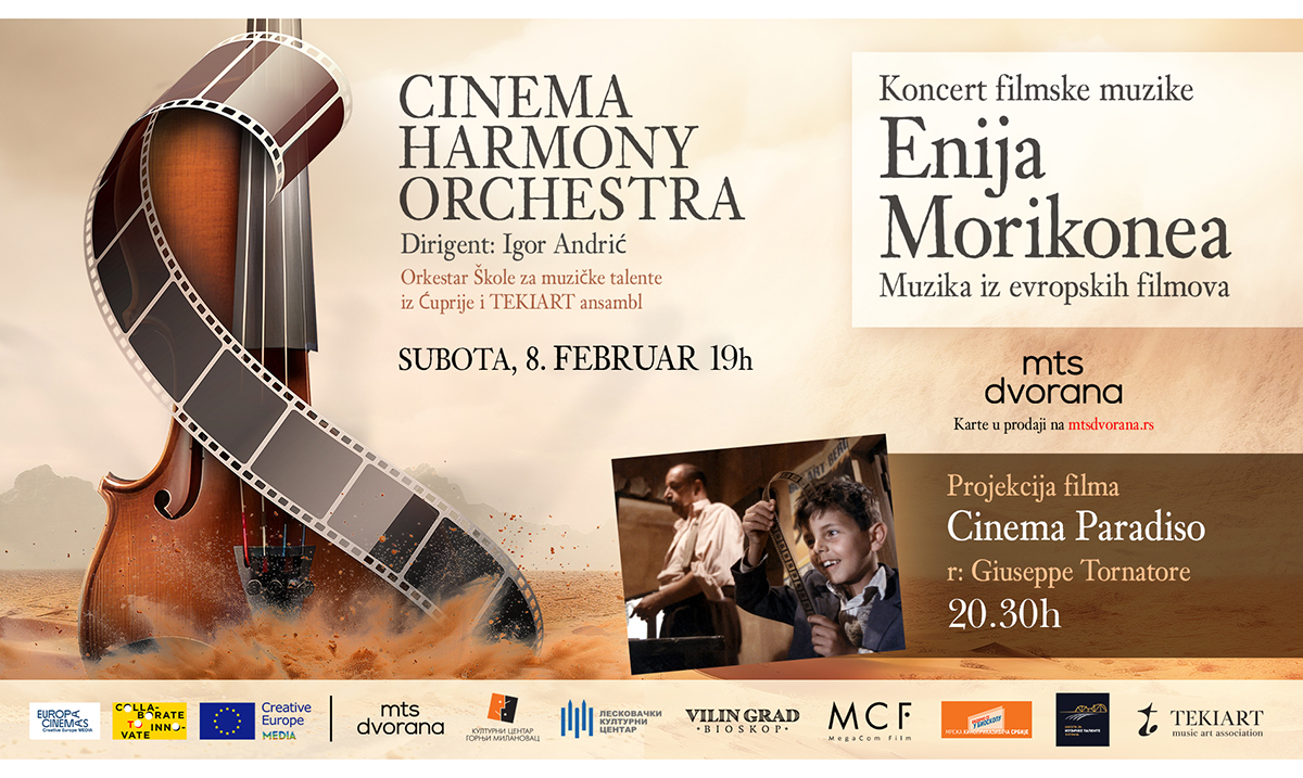 Koncert filmske muzike Enija Morikonea i projekcija filma „Cinema Paradiso“ biće održana u subotu, 8. februara u mts Dvorani. Publika će imati priliku da uživa u jedinstvenom spoju filmske muzike i kinematografije, a događaj se organizuje u okviru projekta „CinemaHarmony: Merging European Film and Cultural Heritage“.
