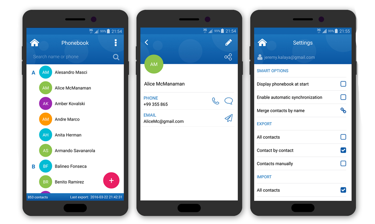 Takođe, treba istaći i dodatne funkcionalnosti koje mogu biti značajne za korisnike kao što su: rad sa sačuvanim kontaktima direktno u oblaku (engl. cloud), korišćenje kontakata iz aplikacije za pozivanje, slanje poruka, deljenje kontakata sa prijateljima. Obezbeđeno da se pod jednim nalogom čuvaju kontakti sa različitih telefona kao i mogućnost da se kontaktima pristupi sa bilo kog telefona. Kad izgubite telefon dovoljan je jedan klik da povratite sve svoje kontakte, kad vam se isprazni baterija kontaktima možete pristupiti sa drugog telefona, kad menjate telefon lako prebacujete kontakte na novi telefon.