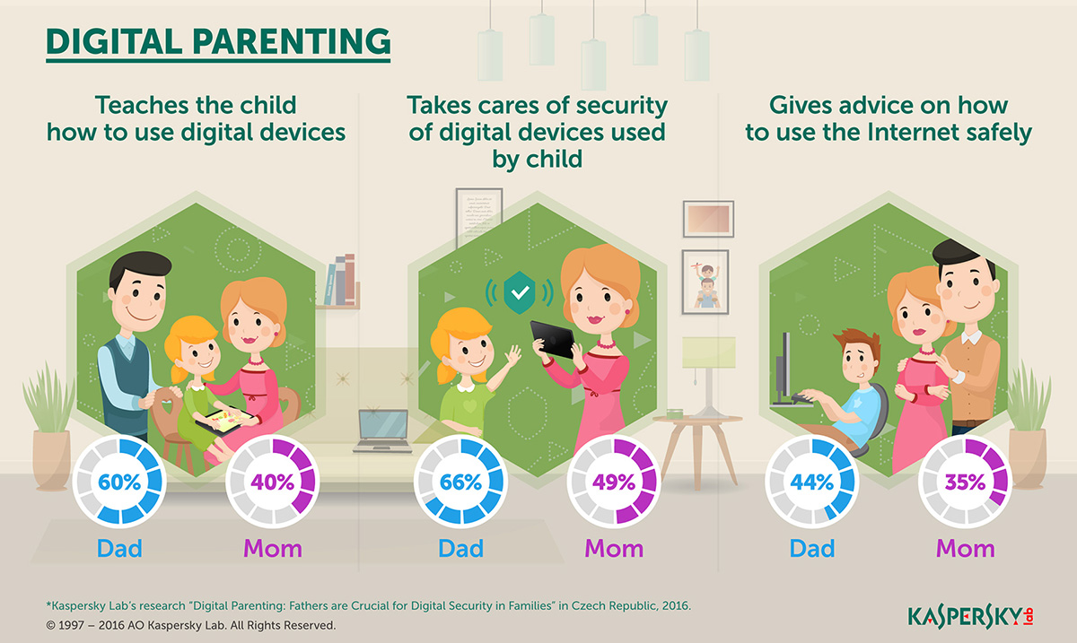 Kompanija Kaspersky Lab, zajedno sa profesorom Dejvidom Smahelom (David Smahel) sa univerziteta Masaryk, sprovela je istraživanje kako bi otkrila na koji način se roditelji u Češkoj suočavaju sa novim izazovima, kao što je činjenica da sve veći broj dece koristi digitalne uređaje i internet. Kada je reč o očuvanju bezbednosti dece na internetu, rezultati istraživanja ukazuju na to da je u modernim porodicama obično otac taj koji uči decu kako da koriste digitalne uređaje, daje im savete kako da bezbedno koriste Internet i instalira bezbednosna rešenja.
