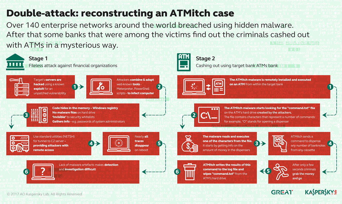 U februaru 2017. godine, kompanija Kaspersky Lab objavila je rezultate istrage misterioznih napada (bez malicioznih fajlova) na banke: kriminalaci su koristili memorijski malver kako bi zarazili bankarske mreže. Slučaj ATMitch dao je bolji uvid u to zbog čega kriminalci koriste ovaj malver.