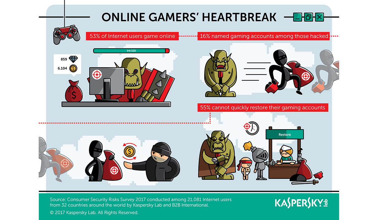 Onlajn gejming se veoma brzo pretvorio u veoma isplativ posao, sudeći po činjenici da je trenutni broj ljudi koji poseduje naloge za igranje na mreži veći nego ikada ranije. Prema istraživanju koje je sprovela kompanija Kaspersky Lab, više od polovine korisnika interneta (53 odsto) svakodnevno koristi onlajn gejming, a ta brojka raste do 64 odsto – kada su u pitanju korisnici između 25 i 34 godine i do 67 odsto – za one između 16 i 24 godina. Ova činjenica takođe može biti veoma isplativa i za sajber kriminalce jer hakovani gejming nalozi mogu biti prodavani na crnom tržištu. Uprkos ovoj pretnji, korisnici onlajn gejminga često dopuštaju da njihovi nalozi budu podložni pokušajima hakovanja, rizikujući svoj dragoceni napredak u igrama i lične podatke, a neki čak i svoje prihode.